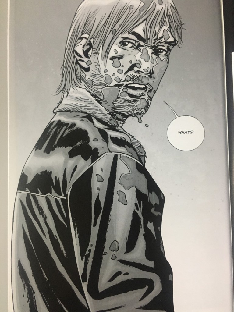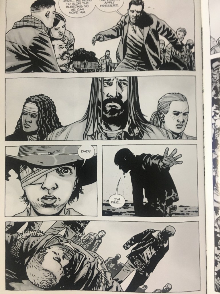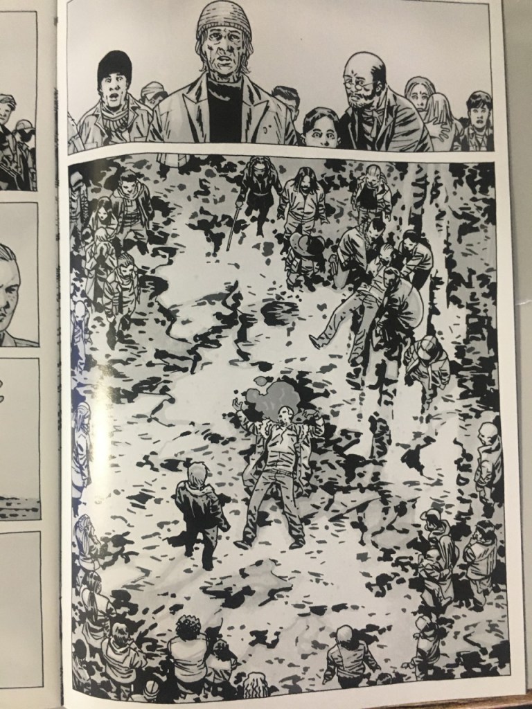 On the second page is a splash page because one of the panals is very large and taking most of the page. this panal i find is important because its at a birds eye view showing everyone around Rick and the dead body, everyone is shocked because they saw someone bleedout to death.